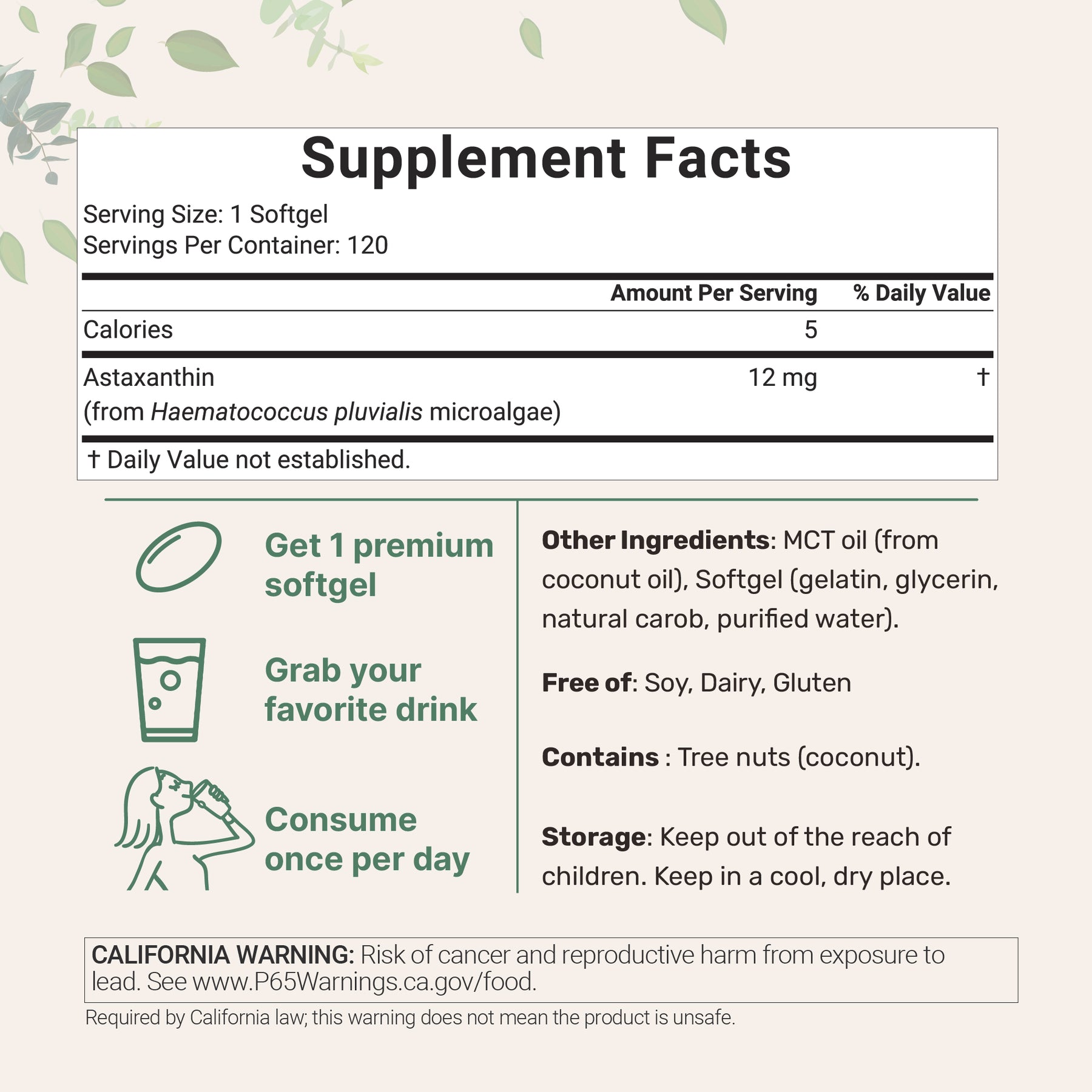 - Premium Astaxanthin supplement. Ingredients must pass our 3rd party lab tests to ensure a product that is safe, pure, and potent.